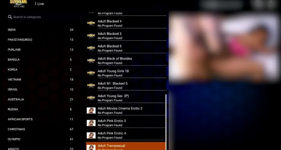 Dream is used for watching TV, similar to Stellar. Scroll down to find the Adults section, which also includes 603 channels, just like in Stellar. The adult channels in both apps are the same. Multi-screen and pause/rewind/fast forward are not supported.